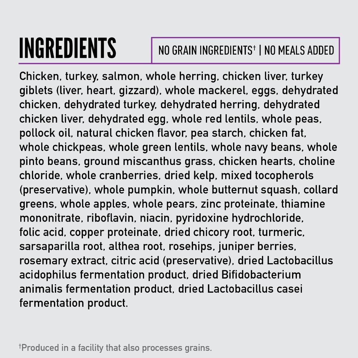 Fresh chicken (31%), raw turkey (8%), raw salmon (6%), raw whole herring (5%), fresh chicken giblets (liver, heart) (4.5%), raw turkey liver (4%), raw whole mackerel (4%), fresh eggs (4%), dehydrated chicken (4%), dehydrated turkey (4%), dehydrated herring (4%), dehydrated chicken liver (4%), dehydrated egg (4%), whole red lentils, whole peas, pollock oil (3%), whole chickpeas, whole green lentils, whole pinto beans, whole navy beans, pea starch, ground miscanthus grass, chicken fat (0.5%), fresh whole pumpkin, fresh whole butternut squash, dried kelp, dried chicory root, fresh whole apples, fresh whole carrots, fresh whole pears, fresh whole zucchini, fresh beet greens, fresh kale, fresh spinach, fresh turnip greens, whole blueberries, whole cranberries, whole saskatoon berries, burdock root, lavender, marshmallow root, milk thistle, rosehips, turmeric.