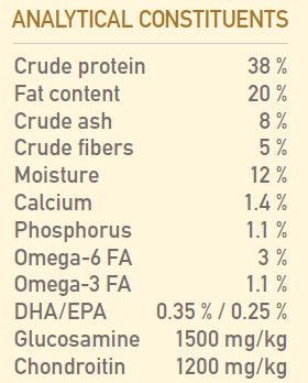 Crude Protein 38%, Fat Content 20%, Crude Ash 8%, Crude Fiber 5%, Moisture 12%, Calcium 1.4%, Phosphorus 1.1%, Omega-3 Fatty Acids 1.1%, Omega-6 Fatty Acids 3%, DHA (Docosahexaenoic Acid) 0.35%, EPA (Eicosapentaenoic Acid) 0.25%