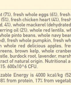 Fresh Chicken (23%), Raw Turkey (10%), Fresh Chicken Giblets (Liver, Heart) (8%), Raw Whole Herring (6%), Raw Whole Hake (5%), Fresh Eggs (5%), Dehydrated Chicken (4%), Dehydrated Turkey (4%), Dehydrated Mackerel (4%), Dehydrated Sardine (4%), Dehydrated Herring (4%), Chicken Fat (4%), Whole Red Lentils, Whole Peas, Whole Green Lentils, Whole Chickpeas, Lentil Fibre, Whole Pinto Beans, Whole Navy Beans, Raw Turkey Liver (2%), Pollock Oil (2%), Pea Starch, Dried Kelp, Fresh Whole Pumpkin, Fresh Whole Butternut Squash, Fresh Whole Zucchini, Fresh Whole Carrots, Fresh Whole Apples, Fresh Whole Pears, Dried Chicory Root, Fresh Kale, Fresh Spinach, Fresh Beet Greens, Fresh Turnip Greens, Whole Cranberries, Whole Blueberries, Whole Saskatoon Berries, Turmeric, Milk Thistle, Burdock Root, Lavender, Marshmallow Root, Rosehips.