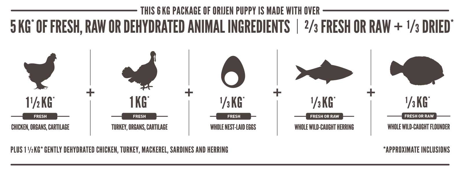Introducing ORIJEN® Puppy, an expertly formulated, protein-rich diet designed to support your puppy’s optimal development. Emphasizing a Biologically Appropriate diet filled with high-quality animal ingredients, ORIJEN® delivers superior nourishment with 85% fresh or raw free-run chicken and turkey, plus wild-caught or sustainably farmed fish. Our WholePrey approach incorporates nutrient-dense animal ingredients like organs and bones, providing unmatched nutrition. Choose ORIJEN® to set the standard for your puppy’s growth and well-being.