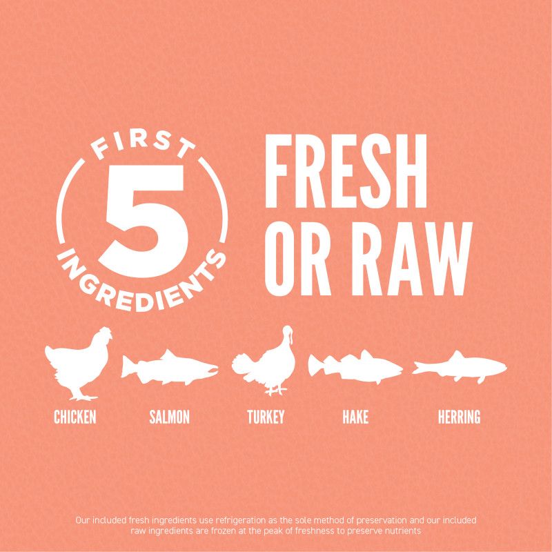 - First 5 Ingredients: Chicken, Salmon, Turkey, Hake, Herring