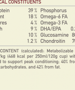 Metabolizable Energy is 3900 kcal/kg (468 kcal per 250ml/120g cup) with calories distributed to support peak conditioning; 40% from protein, 18% from carbohydrates, and 42% from fat. | ORIJEN Small Breed is formulated to meet the nutritional levels established by FEDIAF for All Life Stages.