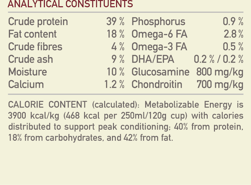 Crude protein 39%, Fat content 18%, Crude ash 9%, Crude fibres 4%, Moisture 12%, Calcium 1.4%, Phosphorus 1.1%, Omega-6 FA 2.8%, Omega-3 FA 0.5%, DHA 0.2%, EPA 0.2%