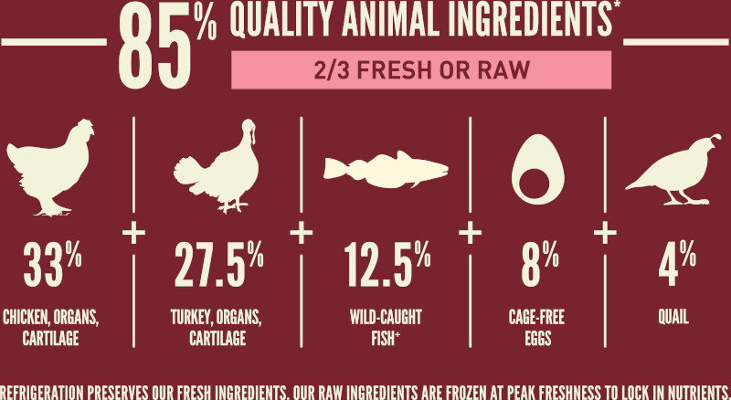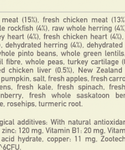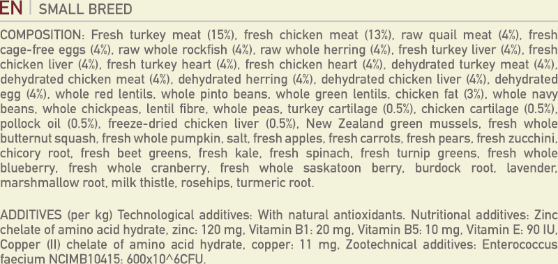 Raw turkey (19%), fresh chicken (18.5%), raw quail (4%), raw whole hake (4%), raw whole herring (4%), raw turkey liver (4%), fresh chicken giblets (liver, heart) (4%), fresh eggs (4%), dehydrated turkey (4%), dehydrated chicken (4%), dehydrated herring (4%), dehydrated chicken liver (4%), dehydrated egg (4%), whole red lentils, whole pinto beans, whole green lentils, chicken fat (3%), whole navy beans, whole chickpeas, lentil fibre, whole peas, pollock oil (0.5%), pea starch, dried kelp, New Zealand green mussels, fresh whole butternut squash, fresh whole pumpkin, salt, fresh whole apples, fresh whole carrots, fresh whole pears, fresh whole zucchini, dried chicory root, fresh beet greens, fresh kale, fresh spinach, fresh turnip greens, whole cranberries, whole blueberries, whole saskatoon berries, turmeric, milk thistle, burdock root, lavender, marshmallow root, rosehips.