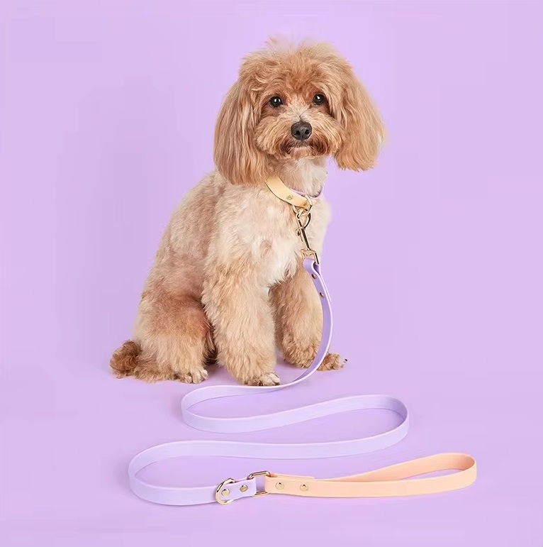 Imagine a leash and collar set designed with both functionality and style in mind. This set is crafted from soft PVC material, known for its durability and water resistance. The PVC gives the collar and leash a smooth, flexible feel, making them comfortable for your pet to wear and easy for you to handle